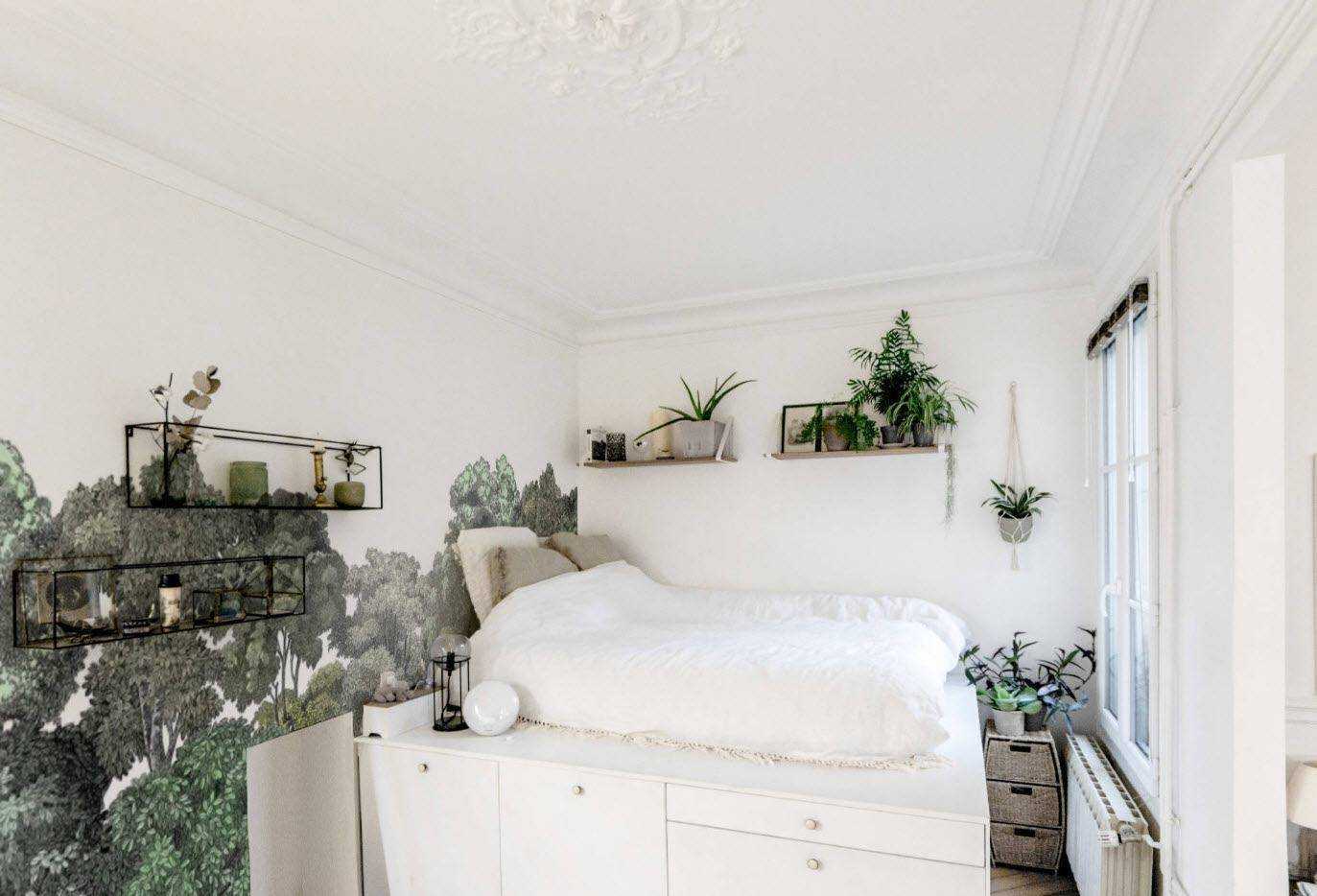 Кровать не обязательно должна занимать центральное место в небольшой спальне. Чтобы сэкономить ограниченное пространство, вы можете смело поместить ее в угол, чтобы обе стороны мебели для сна примыкали к стене. Такая установка кровати не должна приводить к каким-либо неудобствам, особенно если пользователем является только один человек. Более того, иногда стена, прилегающая к боковой стороне, придает человеку большее чувство безопасности. Однако в спальне 13 кв. м можно разметить кровать только к одной стене у изголовья, что будет отличным решением, так как площадь комнаты позволяет это сделать.