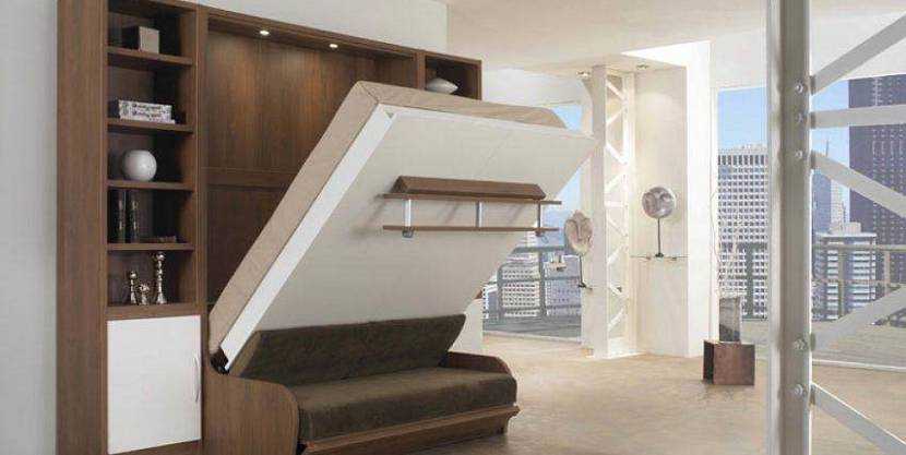 - Можно продумать вариант использования подъемной кровати, которая прячется в узкий шкаф-стенку. Конечно, размещать ее напротив мягкой мебели не получится, но если оставить пространство в другой части комнаты, то спальня будет «раскладываться» только тогда, когда это нужно.