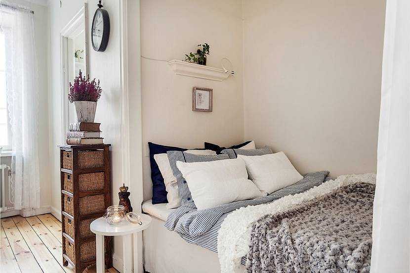 - Не следует покупать широкие тумбы, шкафы или комоды. Акцент делают на компактной мебели. Исключением станет только кровать стандартных размеров. Ее, кстати, лучше ставить посередине, словно разделяя комнату на две небольшие зоны квадратной формы.
