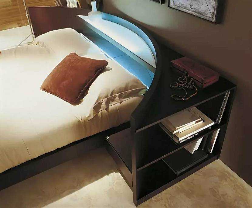 Удачной моделью будет кровать с боковыми полками. Тогда необходимость в приобретении прикроватных тумб исчезнет, что положительно скажется на метраже.
