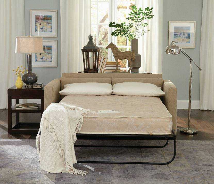 Можно вместо кровати использовать раскладной диван. Атмосфера спальни утрачивается, но диван практичнее, требует меньше места, может служить не только для сна.
