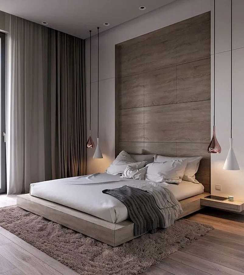 Это могут быть полки, ниши, картины, деревянные оправы для зеркал. Можно сделать одну сторону полностью из дерева. Она будет создавать отдельный мир на контрасте с остальным пространством, отделять территорию с кроватью от остальной части комнаты, создавать теплую, уютную атмосферу.