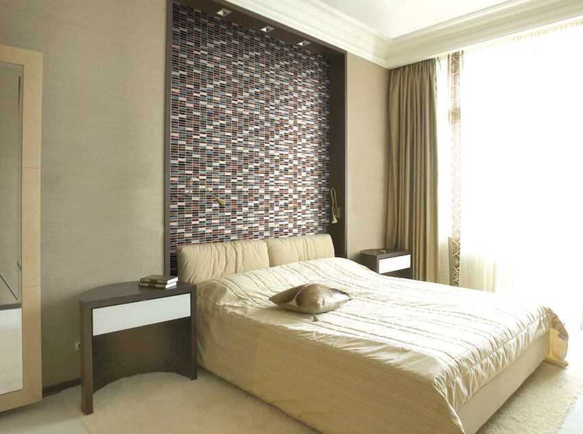 На фото зона отдыха отделена двухуровневым потолком, стена у изголовья украшена цельным зеркалом и мозайкой.