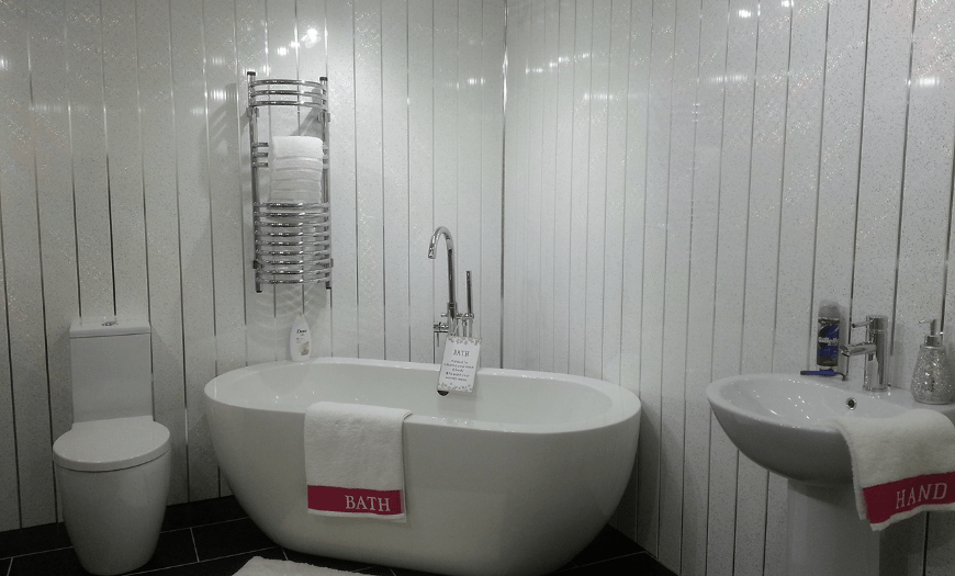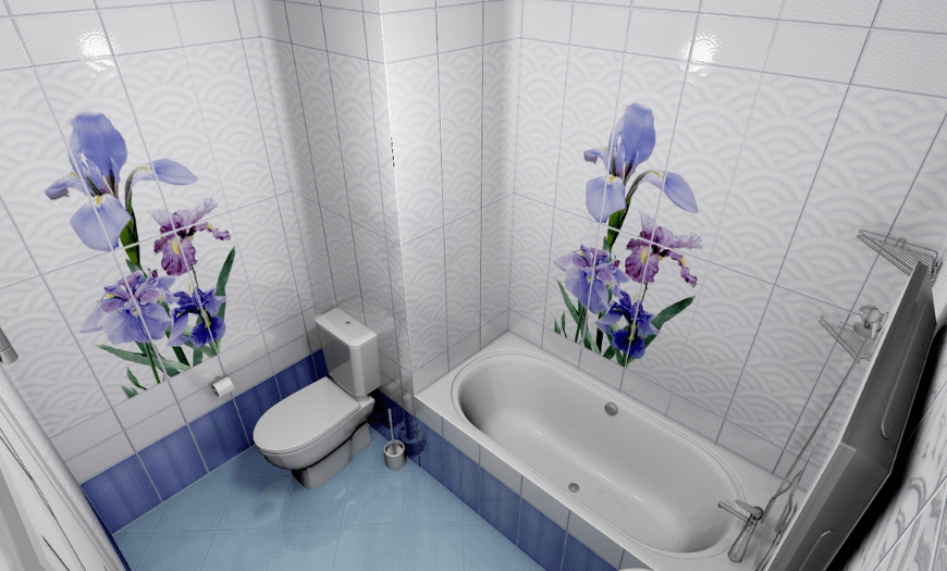 Получить аккуратный дизайн удобного совмещенного санузла позволит использование водостойкого пластика. Панели из этого материала представлены в разной цветовой гамме. Можно подобрать виды с изящными рисунками и геометрическими переплетениями.