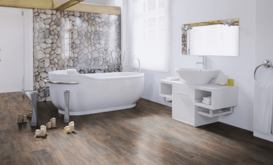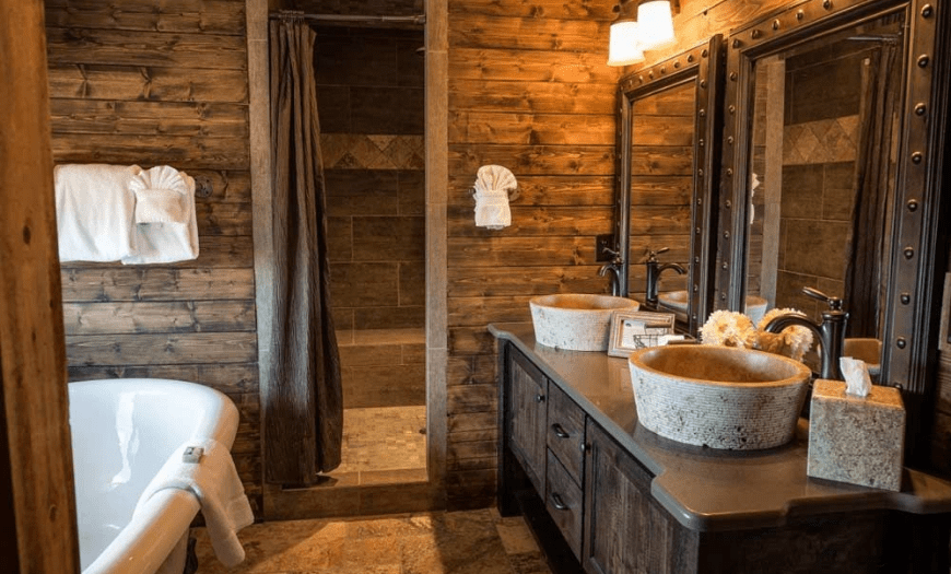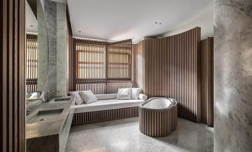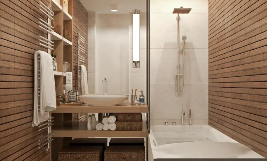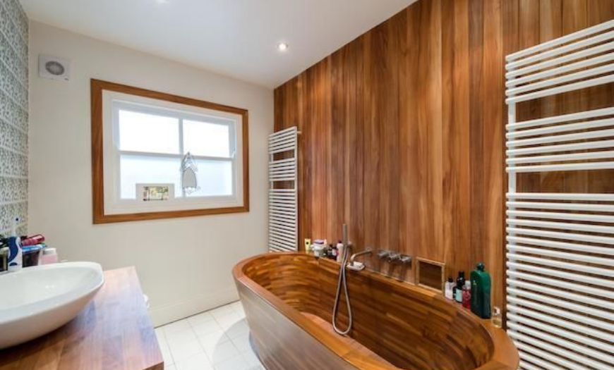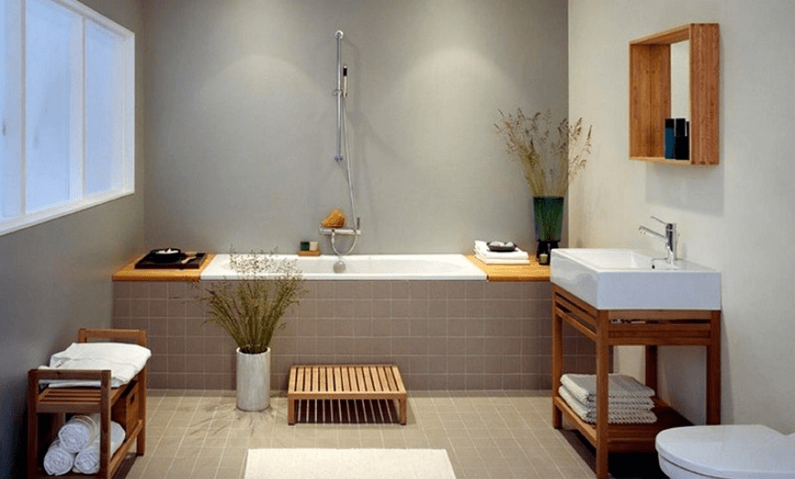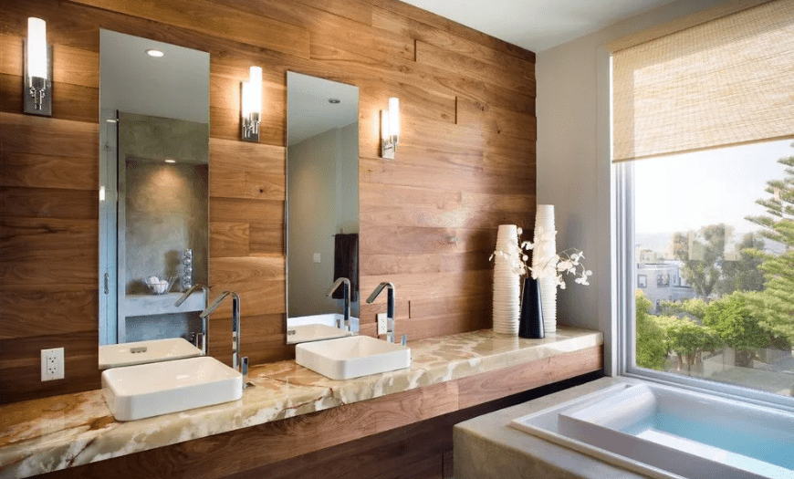 Натуральный материал привлекает экологической безопасностью. Для ванной дерево применялось редко. Это объясняется его способностью деформироваться и разрушаться при попадании капель. Можно использовать деревянные виды отделки, обладающие высокой плотностью. Это брус или рейки из древесины ироко, мербау, дуба, тика