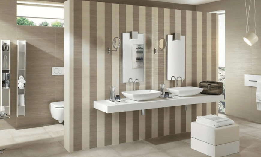 Лучше использовать керамическую плитку или другой материал, обладающий водоотталкивающими свойствами. В вашем распоряжении огромный выбор цветов, форм и видов для отделки стен. Например, о вашей открытости и гостеприимности будет говорить светлая, уютная, просторная ванная комната.