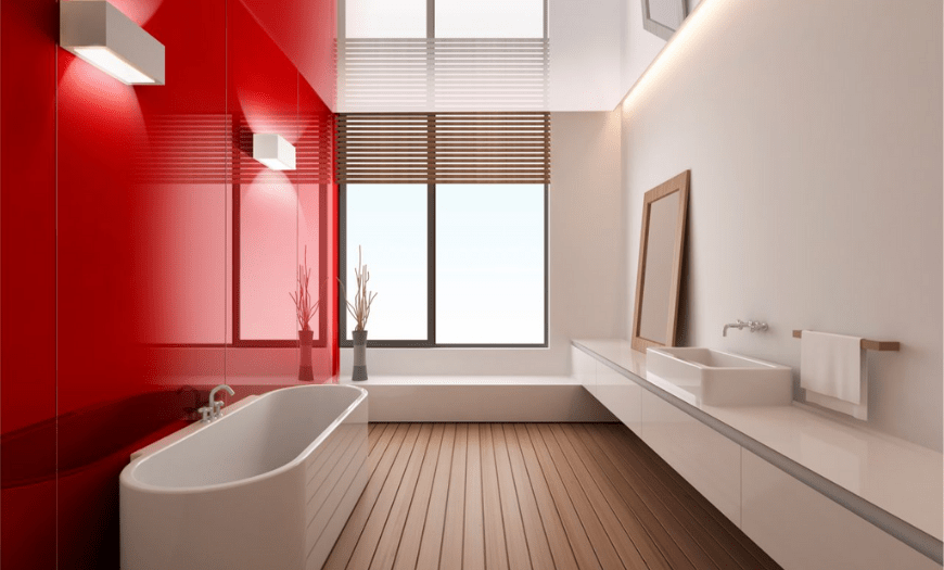 Необычный образ маленькому пространству придает отделка панелями, выполненными из закаленного стекла. Можно подобрать образцы с рисунком. Удивительный эффект придает подсветка. В этом варианте помещение приобретает перспективу.