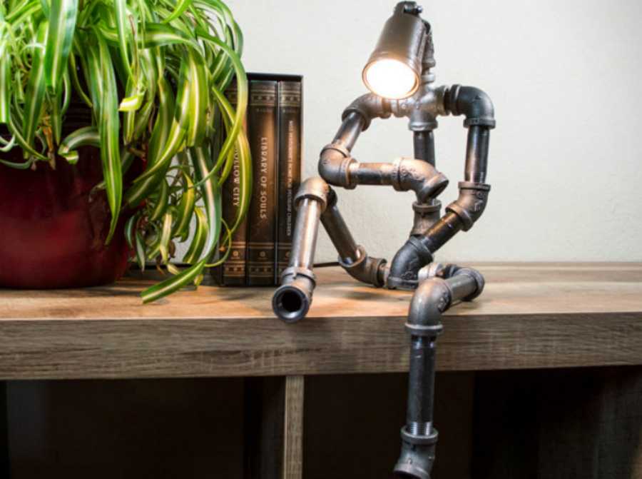Дизайнер этого светильника, видимо, был водопроводчиком. Идея сборки светильников из абсолютно неподходящих узлов и деталей иного назначения, в принципе, не нова, но этот настольный светильник с лампой Эдисона смотрится великолепно и станет отличным дополнением к кирпичным стенам и открытым водопроводным коммуникациям помещения в стиле лофт. Стоимость устройства вполне умерена: если собирать его из водопроводных труб, уголков и тройников, приобретенных в магазине, получится намного дороже.