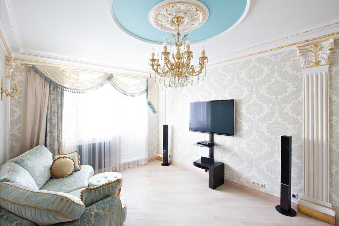Модный и популярный тренд – использование обоев под покраску. Это оптимальный вариант для ремонта гостиной любого размера