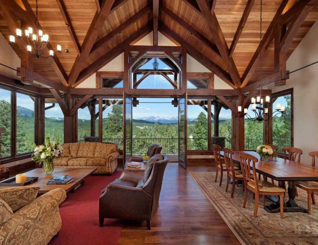 Особую атмосферу создает внутренняя отделка из натуральной древесины и объемные оконные конструкции, позволяющие наслаждаться окружающими видами.