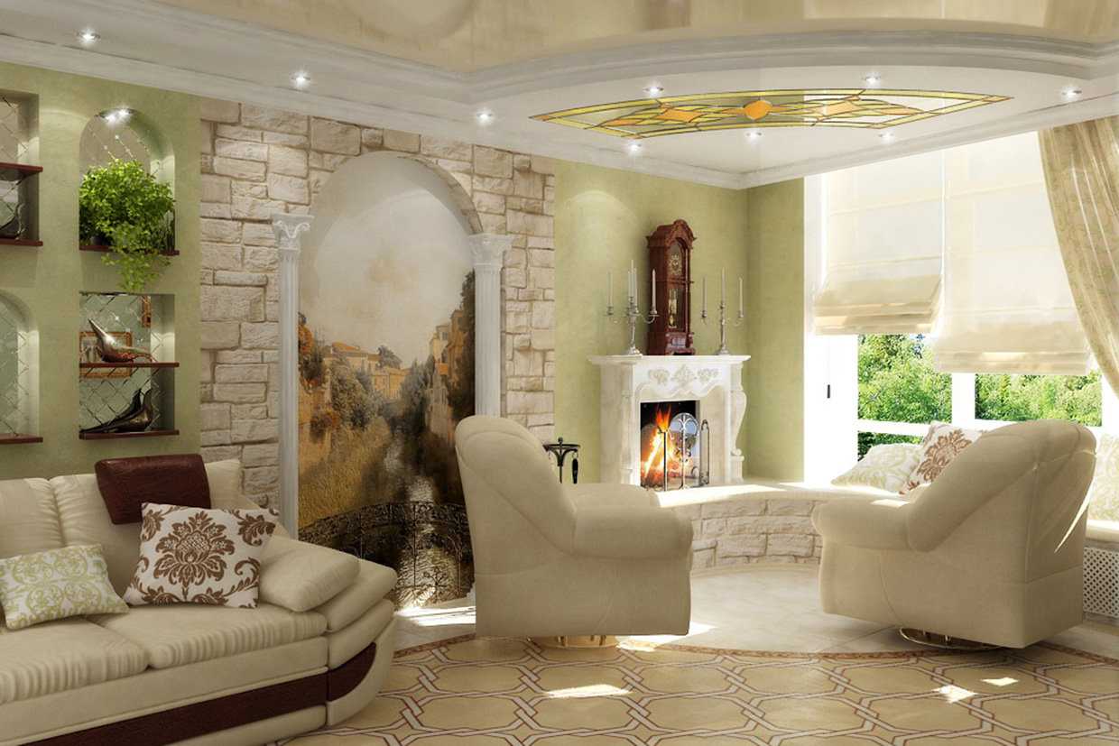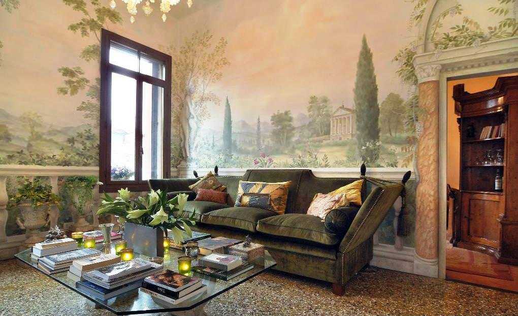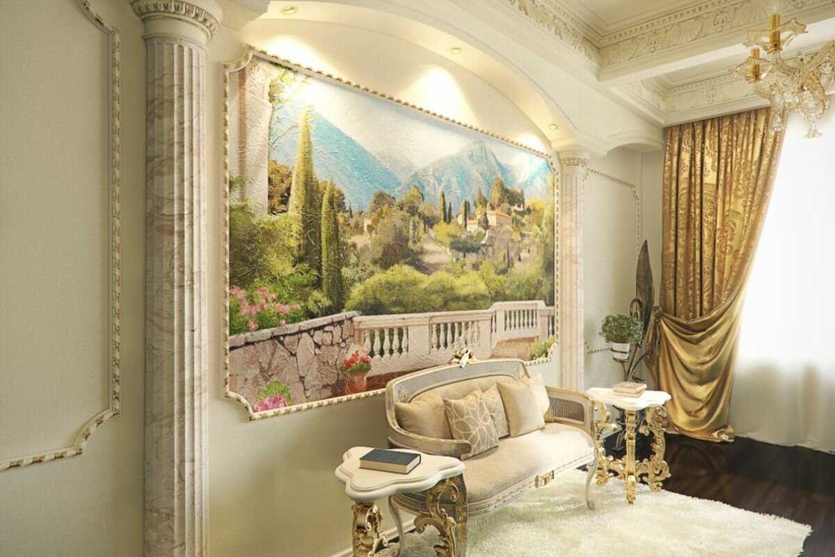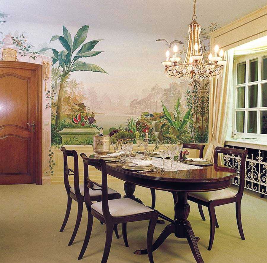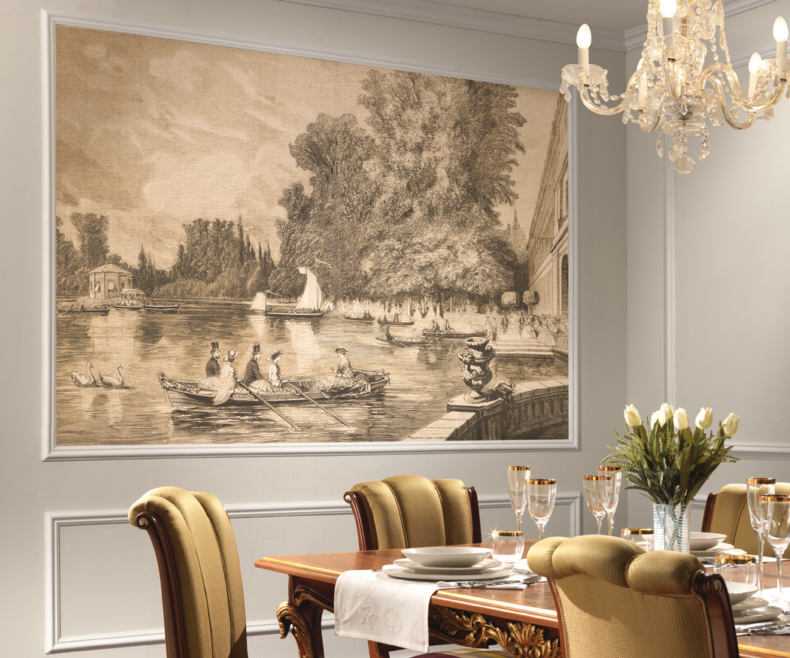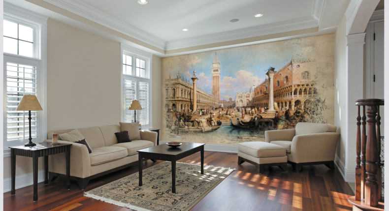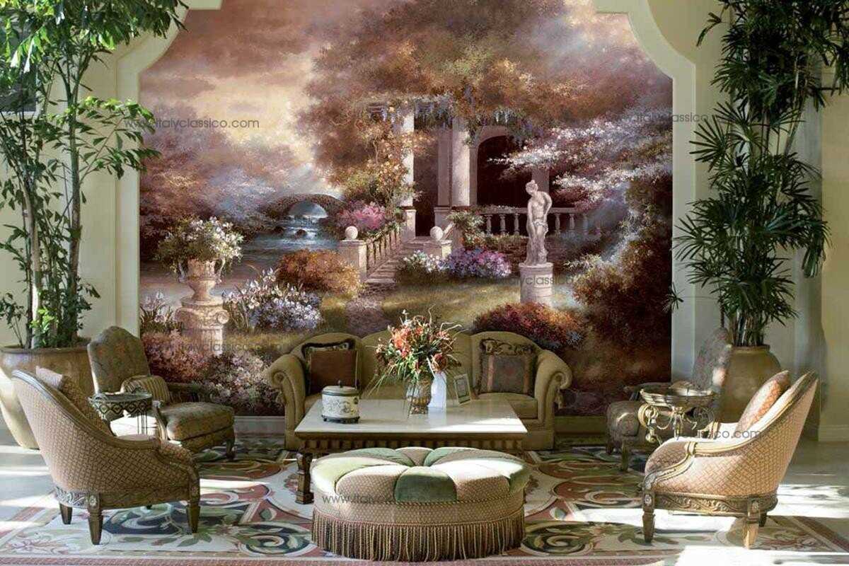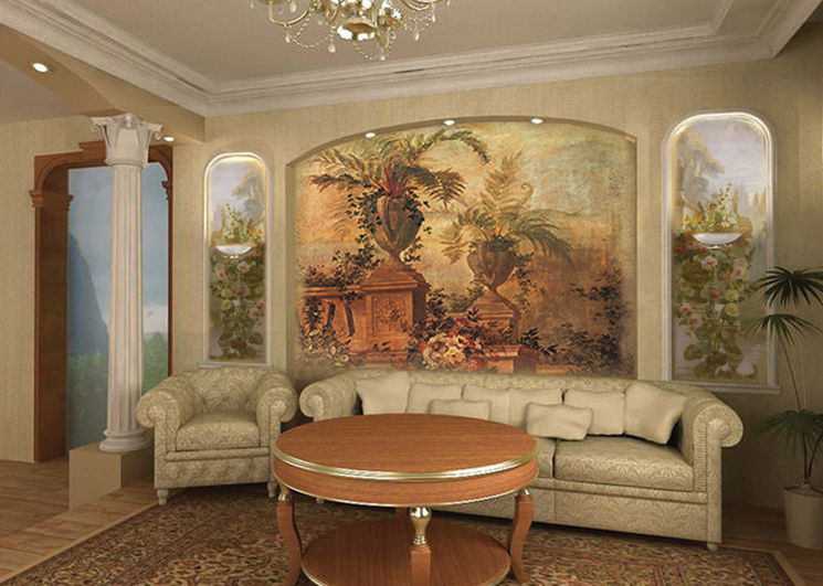 Живописная фреска на стену в гостиной тяготеет, как правило, к классике. Большинство владельцев используют в ней репродукции картин