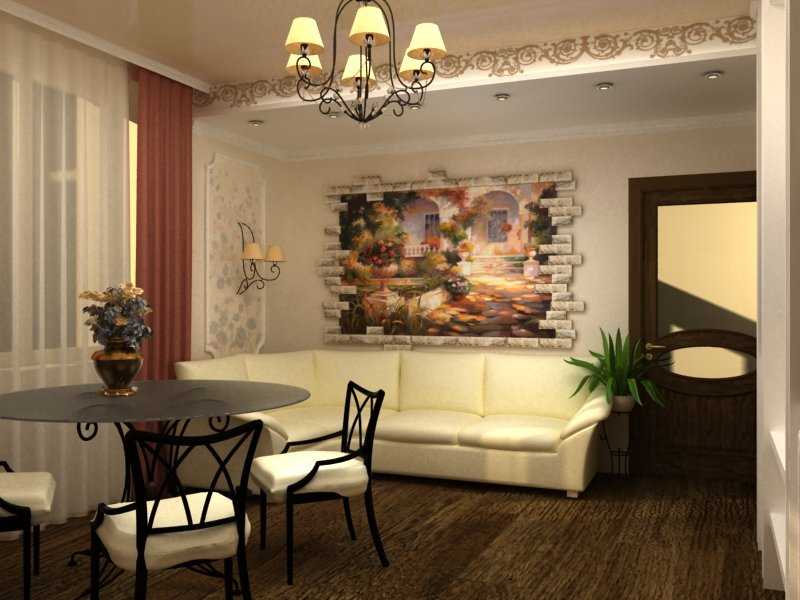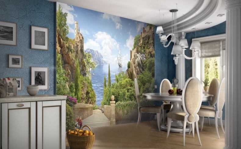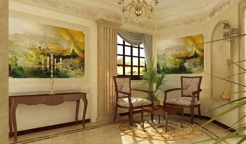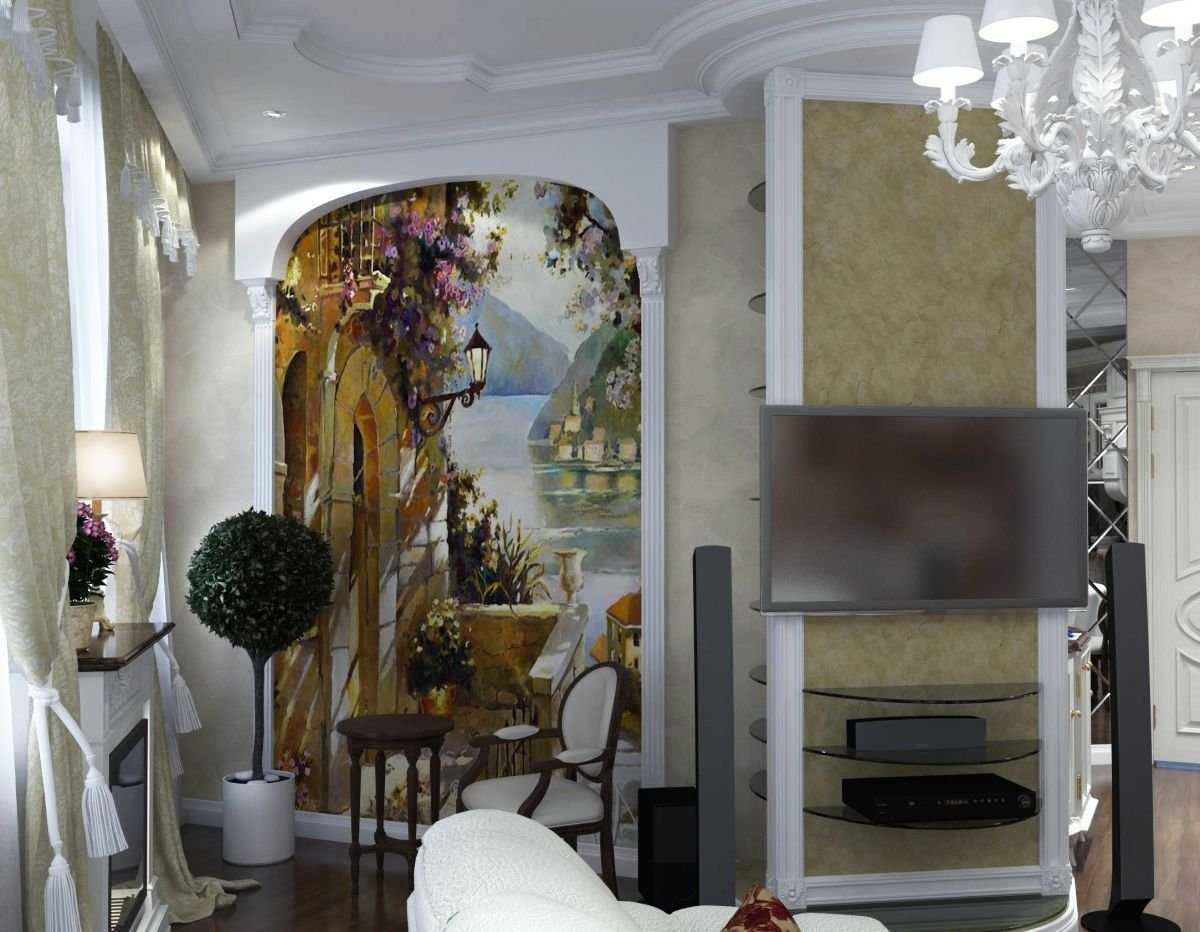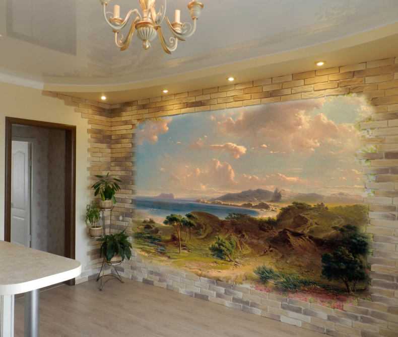 известных мастеров эпохи Возрождения. Однако и сюжеты на тему заданного стиля не менее органично вписываются в общий настрой парадной комнаты. В восточном колорите это могут быть сценки с фауной и флорой Востока. Для средиземноморского интерьера априори подходит море и все, что с ним связано. В хай-теке уместен городской пейзаж или абстрактная череда тоннелей, а для деревенского стиля