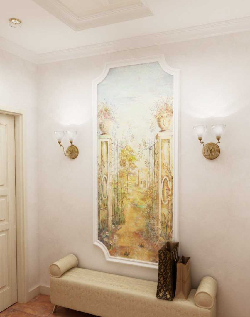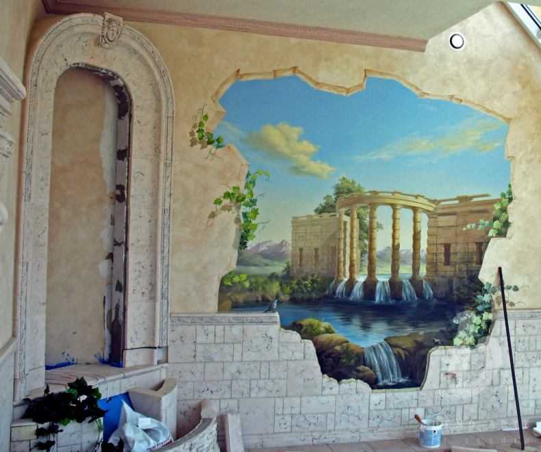 - Края оформляются штукатуркой, благодаря чему создаётся иллюзия, что изображение нанесено непосредственно на стену.
