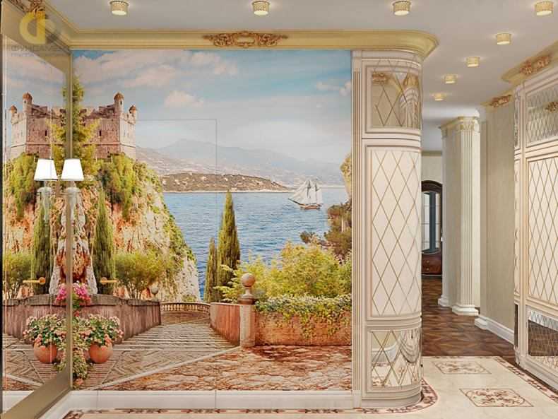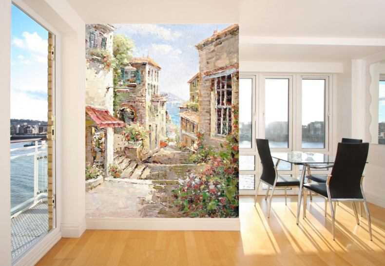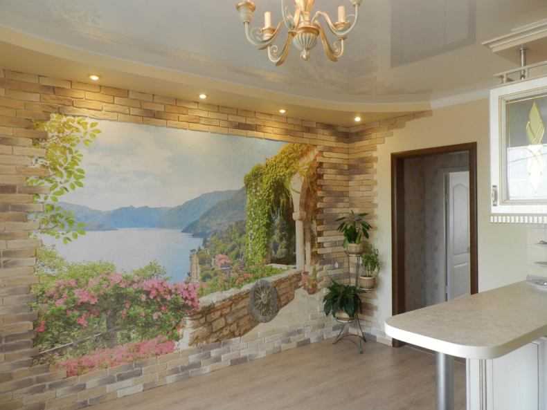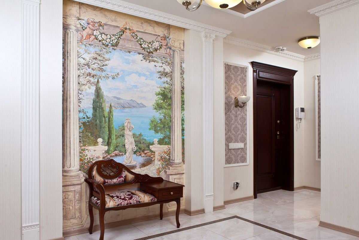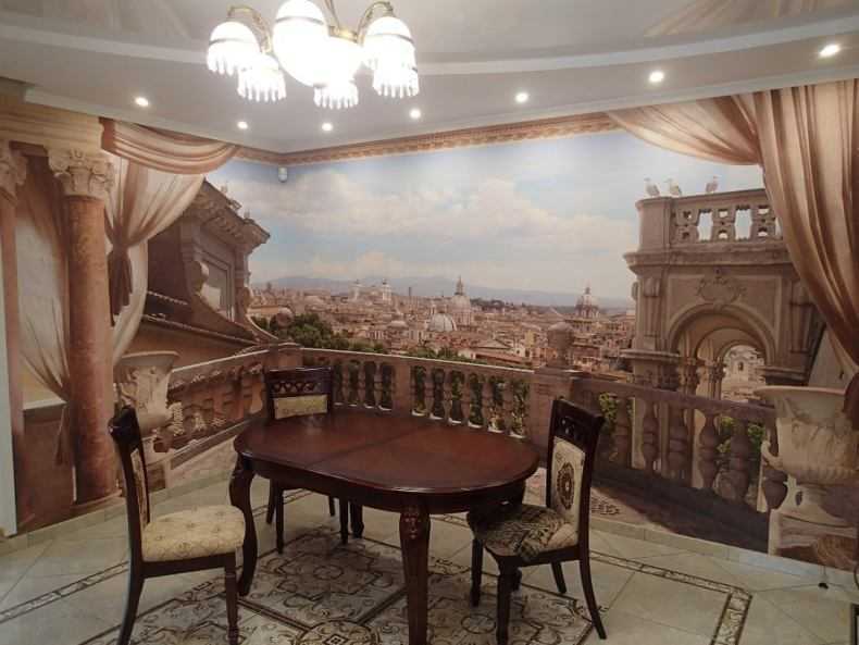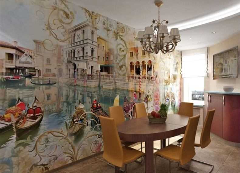 Так, самым простым вариантом, который используется, как правило, при оформлении небольших квартир, являются фрески-обои, или, точнее, фотообои, дизайн которых выполнен в духе старинной росписи, своеобразные картины на стене. Такие обои можно использовать не только на стене или потолке, но и украсить ими, например, шкаф-купе в прихожей, встроенную мебель для кухни. Современная технология изготовления таких фресок предусматривает использование цифровой печати, и позволяет создавать обои самого оригинального вида, открывает возможность создать даже самый безумный дизайн: на фотообои можно перенести любые понравившиеся варианты пейзажей — виды природы, города, портреты, цветы, картины известных художников… Стоит отметить, что, помимо обычных фресок-обоев, существуют специальные влагостойкие фотообои, которыми можно декорировать, например, участки кухни, детской, прихожей, или другие части квартир, которые могут быть подвержены воздействию влаги, включая стену ванной, душевую комнату.