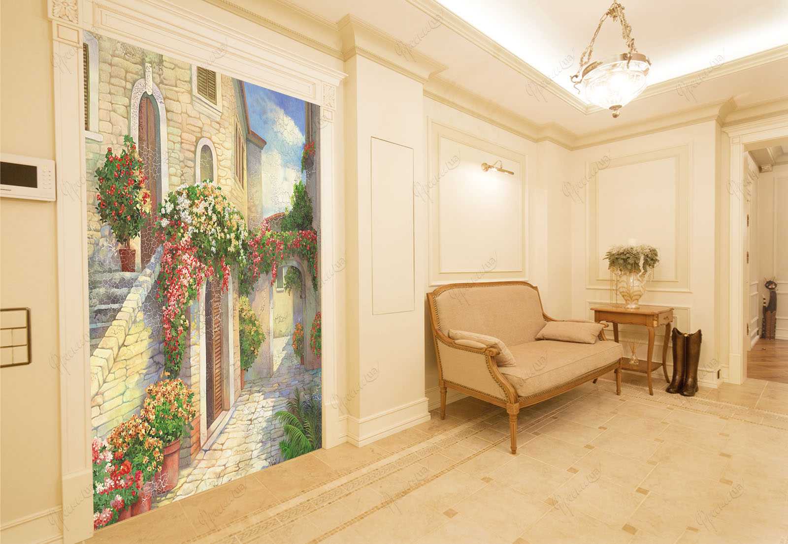 Создание фрески в интерьере обычных городских квартир может быть делом весьма нетривиальным, даже если это простые фотообои, особенно когда требуется красочное оформление труднодоступных поверхностей, закругленного коридора, или сложных конструкций, таких как лестница, например. Самоклеящиеся фрески отлично справляются с такой оригинальной задачей, хотя и требуют специфической подготовки обрабатываемой поверхности — она должна быть максимально ровной, как отшлифованный камень. Помимо этого, тонкая структура таких фресок не позволяет передавать эффект старения, поэтому они будут больше похожи на обои, но качественные и дорогие, как фотообои фактурного типа.