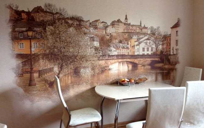 Особый случай – фреска на стену в кухне, в которой ей предстоит жить рядом с огнем и водой. Прежде всего, она должна быть устойчива ко всем раздражителям. В сюжетах же снова согласуемся с жанром интерьера и собственными предпочтениями. Если позволяют размеры помещения можно дополнить