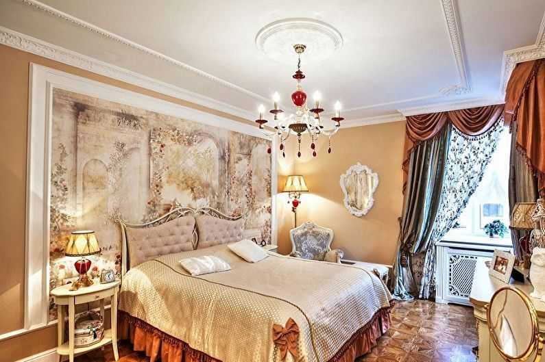Второй вариант расположения фрески — на потолке. Такой вариант обычно содержит лепнину из гипсокартона. Для того чтобы покрыть фреской потолок он должен быть достаточно высоким, чтобы за счет рисунка помещение не сокращалось.