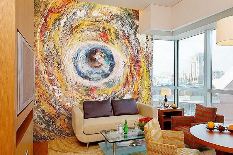 Важно обратить внимание на то, что синие, зеленые тона способствуют снятию эмоционального напряжения, а красный может спровоцировать агрессию. Зачастую фрески-абстракции на стене выступают акцентным элементом;
