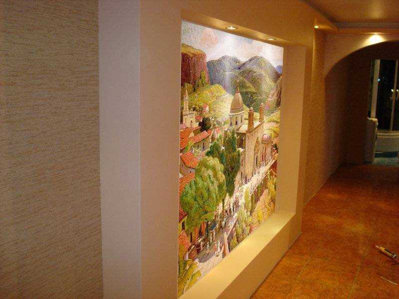 Фрески на плотной и прочной основе вставляются прямиком в стену, поэтому такое удовольствие стоит недешево – около 10000 руб. за 1 кв. м.