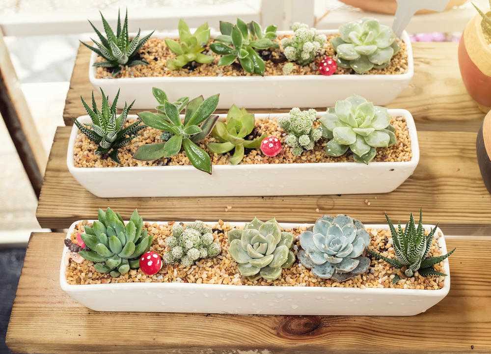 Растения, высаженные в открытые шкатулки, станут интересной интерьерной композицией. Мелкие суккуленты надолго сохранят ее привлекательность, так как ограниченное пространство не даст им разрастись.