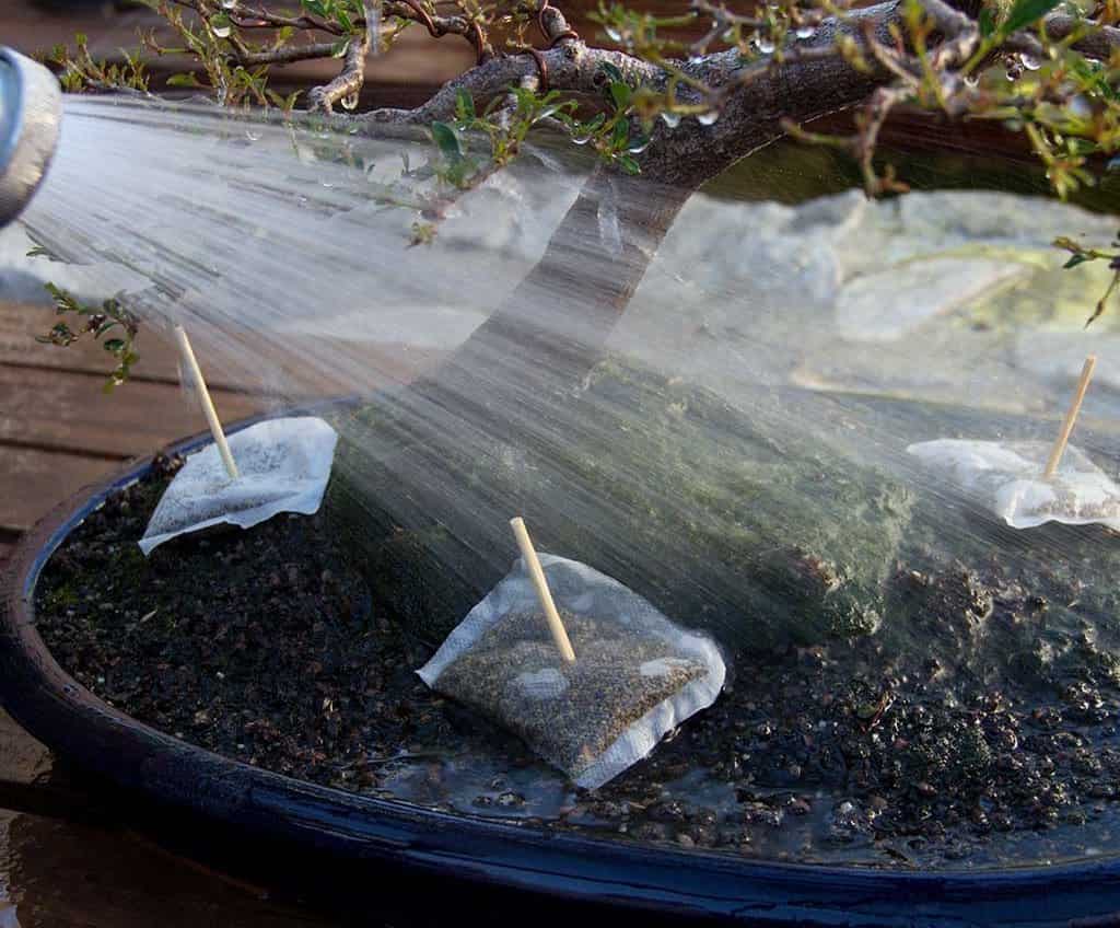 Поливают бонсай чаще всего классическим «верхним» методом. Но есть одно «но»: такие растения предпочитают полив с насадкой-разбрызгивателем. Прибегать к рассеиванию воды необходимо для того, чтобы вода распределялась равномернее по широкой емкости. Альтернативный способ полива — погружение емкости с больший контейнер с водой для насыщения субстрата с последующим полным стеканием «свободной» воды.