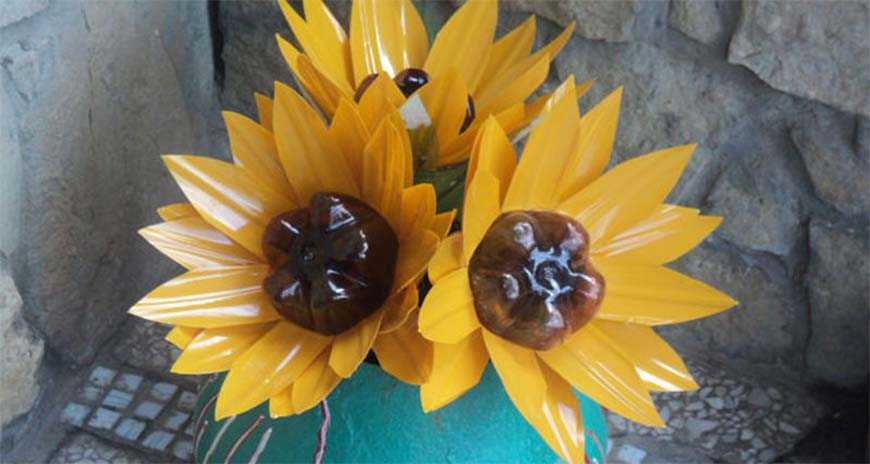 Использовать тару можно в первоначальном виде или окрасить. Яркая эмаль поможет при выполнении любой идеи. Наверняка все видели, что дно у бутылки имеет форму цветка, если залить его акриловой краской, получиться ромашка.