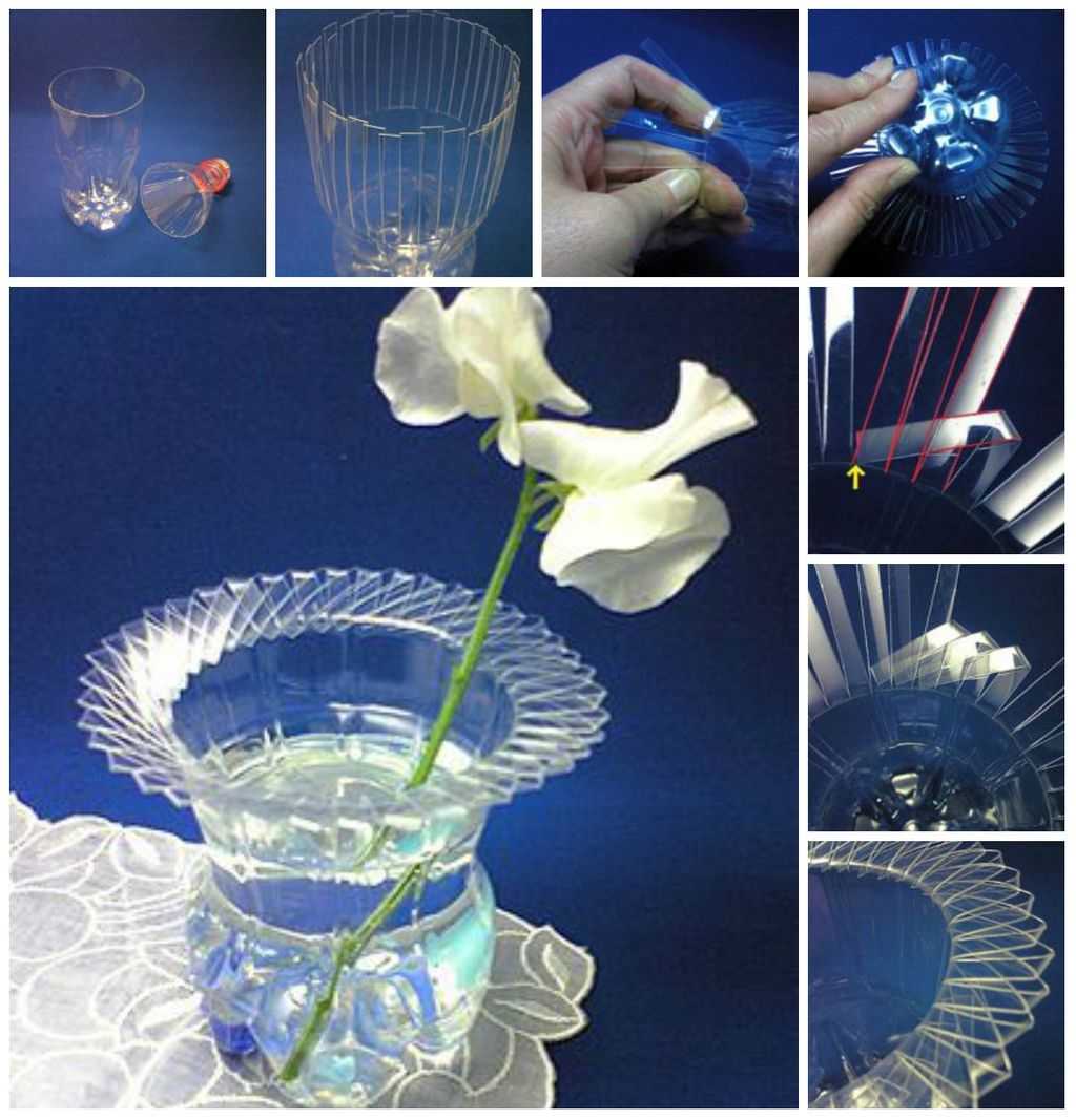 Для размещения самодельного букета понадобится подходящий сосуд, просто отрезать часть бутылки – не эстетично. Края среза размечают по линейке, чтобы сделать нарезку, закрепив результат нагреванием загибов. Небольшую прозрачную бутылку срезают под самый верх, у большой емкости срезают около половины. Выбираем материал с рифлением или «талией» посередине, чтобы была интересная основа.