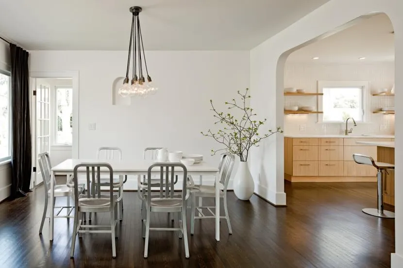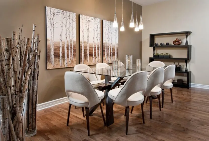 Однако праздничная атмосфера в доме уместна всегда, а не только накануне торжеств. Например, обеденный стол, за которым собирается семья, стоит декорировать и без повода. Прелестная ваза в центре стола, с цветами, ветвями или даже пустая, является великолепным украшением обеденной зоны. Декорированная обеденная зона выделяется из общего пространства. Это «прозрачное» зонирование в кухне или гостиной.