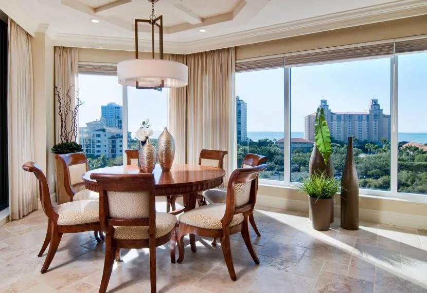 Ваза в центре стола делает столовую зону элегантнее и основательнее, величественнее. Если стол большой, можно установить в центре группу ваз.