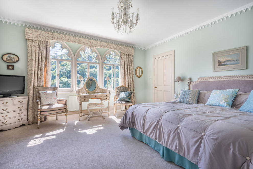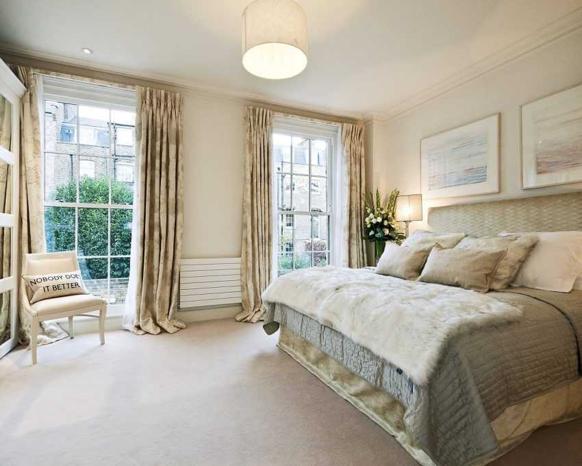Особое внимание уделяется текстилю: покрывало на кровати должно гармонировать с тканью, которая используется для массивных многослойных штор