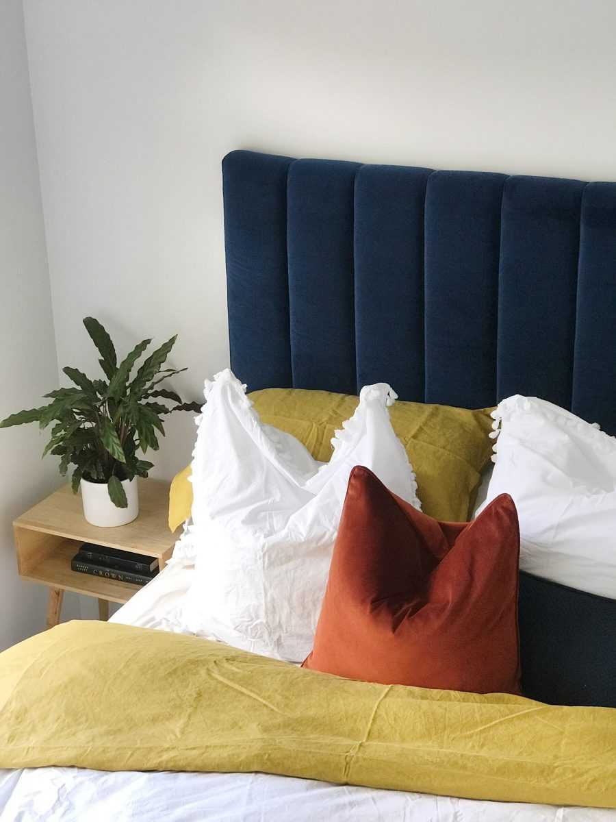 Обратите внимание, как много разных цветов задействовано в этой спальне, но при этом она смотрится стильно и современно. В чем же соль? Они не нарушили ни одного правила из этой статьи: фоновый цвет белый, акцентные цвета с одинаковой и очень низкой насыщенностью, в одинаковой пропорции