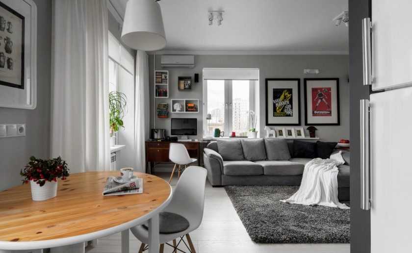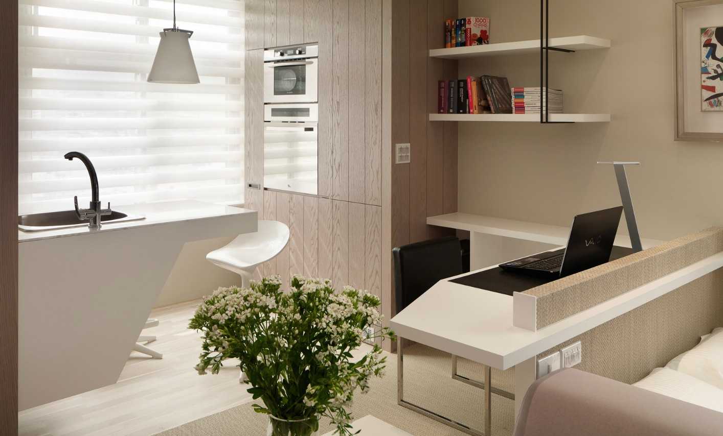 Единственная комната в такой квартире имеет сразу несколько функций. Она является зоной отдыха, гостевой и рабочим кабинетом. Вся мебель должна быть компактной и многофункциональной. Диван, кровать и кресла нужно выбирать с отделениями, предназначенными для хранения вещей. Столик также должен быть компактным и трансформирующимся.