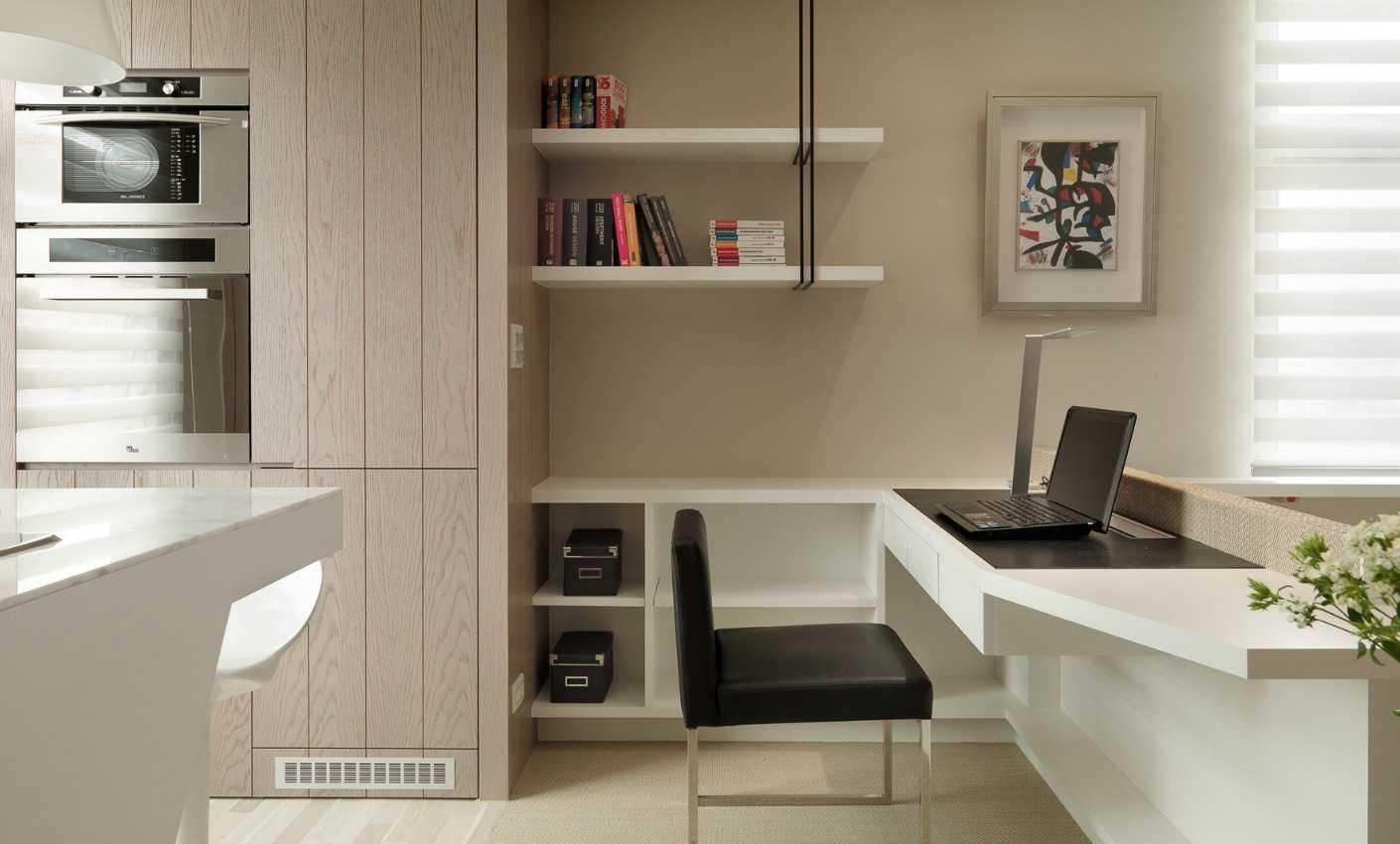 Чем больше встроенной техники и электроники вы сможете себе позволить, тем более удобной будет квартира. Например, лучше встроить микроволновку и кофемашину, чем занимать ими место на столешнице. Если холодильник будет интегрирован в гарнитур, то сверху будет ещё одна или две полочки для хранения.