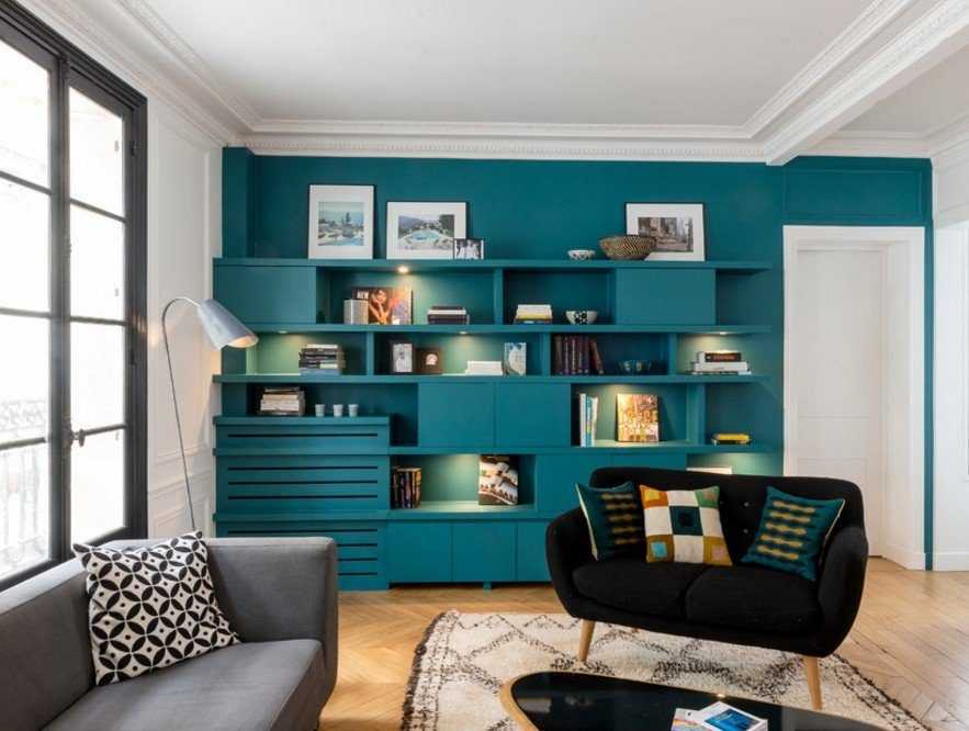 - Насыщенные синие: чирок, персидский синий, лазурныйНасыщенные синие цвета чаще всего встречаются в интерьерах в стиле минимализм – бледных серых, черно-белых или бело-серых. Они используются в дизайне предметов мебели средней величины и в мелком декоре.
