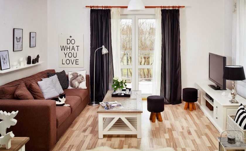В небольшой квартире кровать можно отделить от гостиной открытым шкафом, ширмой, раздвижными дверьми, шторами. Светлые тона на стенах и потолке визуально расширят пространство. Для покрытия пола лучше светлый ламинат.