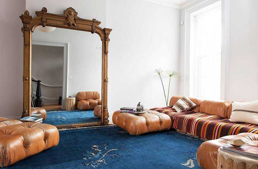 Напольное зеркало в массивной деревянной раме можно расположить в углу комнаты. Правильный угол обзора задаст нужную перспективу помещению, а зеркало станет центральным элементом гостиной.