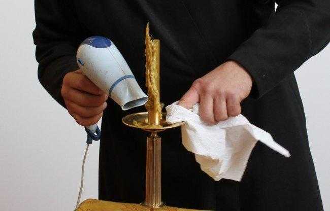 - Можно разогреть изделия теплым воздухом из фена и вытереть салфеткой. Воск расплавится, и вам будет легко его удалить. Чтобы очистить предмет от тонкой пленки вещества, которая все же останется на поверхности стекла, воспользуйтесь любой спиртосодержащей жидкостью. Для обработки труднодоступных мест используйте ватную палочку. Подсвечник заблестит, как новенький.