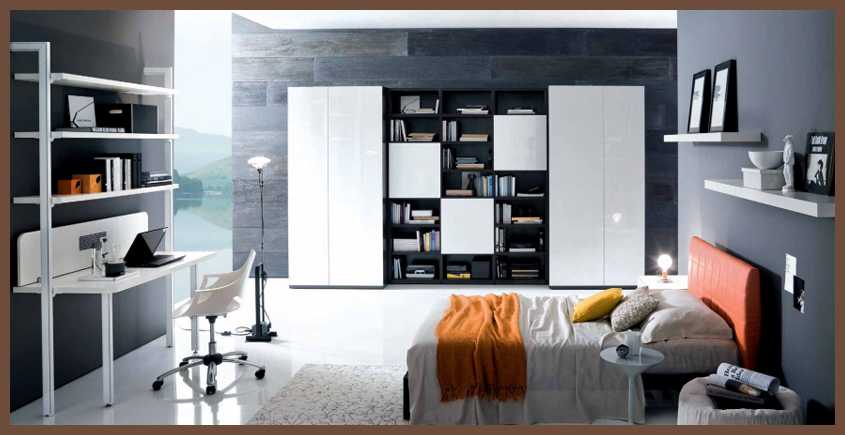 - Если комната небольшая, имеет смысл выбрать встроенный или откидной стол для работы. Первый вариант обычно сочетается с другой мебелью, или размещается в нише. Второй вариант имеет крепление к стене, подъем производят на мебельных петлях, вручную или с помощью механизма (газлифт, пружины).