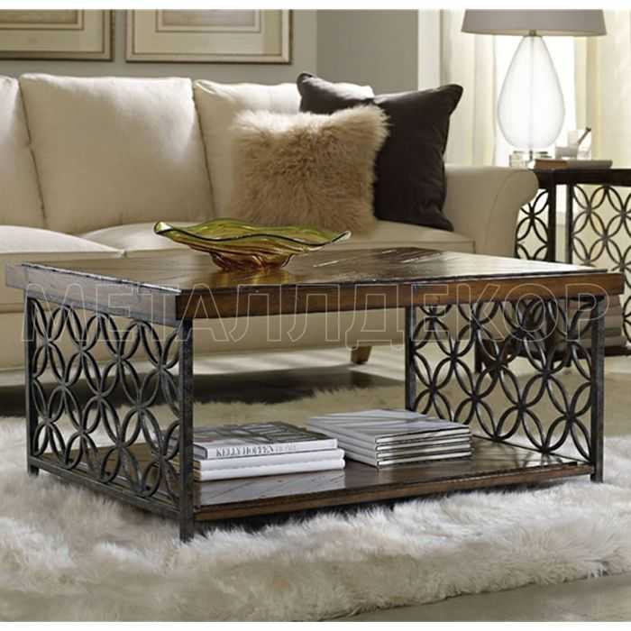 Кованая мебель считается элитной среди других моделей кофейных столиков. В интерьере она смотрится богато и утонченно, модели бывают как классическими, так и нестандартными, дополняя интерьер в стиле лофт и других. Наряду с мебелью из массива или ротанга, кованые маленькие столики могут смотреться в интерьере уютно и легко. Столешницу чаще изготавливают из отличного от металла материала, реже она бывает металлической, чаще – белой, черной, из дерева или стекла. Материал и способ ковки во многом влияет на стоимость. Но по-настоящему необычные модели такой мебели можно приобрести у специалистов ручного труда.