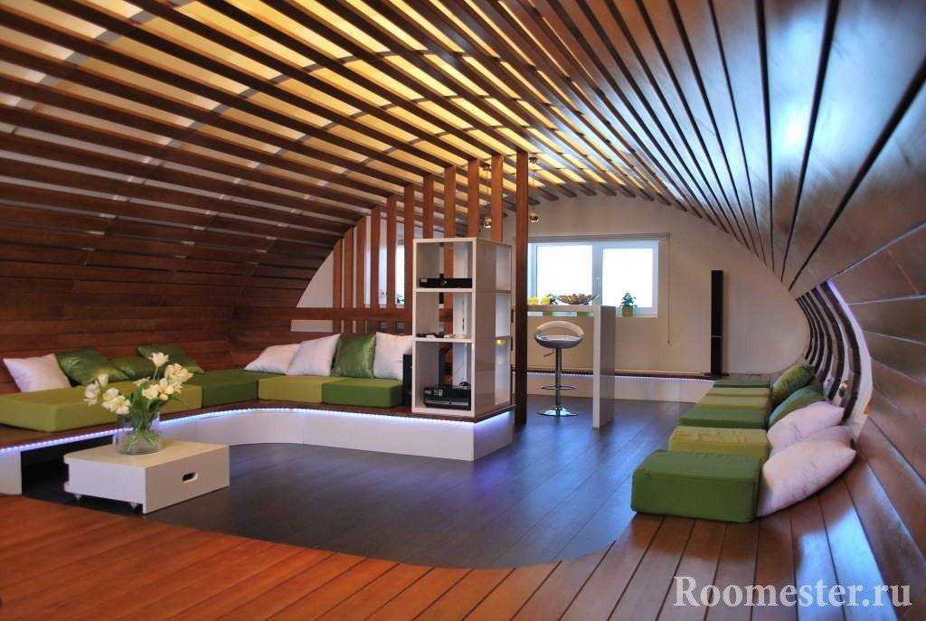 Необычная форма крыши в маленьком пространстве, как правило, забирает часть полезного пространства. Но при грамотном освещении и оформлении эту черту можно интересно обыграть.
