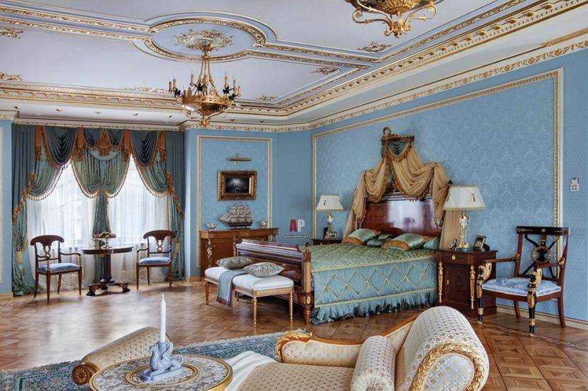 Ампир. Отличительная черта – императорская роскошь, какую подчеркивают позолоченные детали лепнины. В дизайне интерьера непременно обязаны быть тяжеловесные предметы мебели из дорогих пород красного дерева. Свойственный рисунок – воинственная символика: орел, стрела, копье, лавровый венок, ветвь дуба и лук.