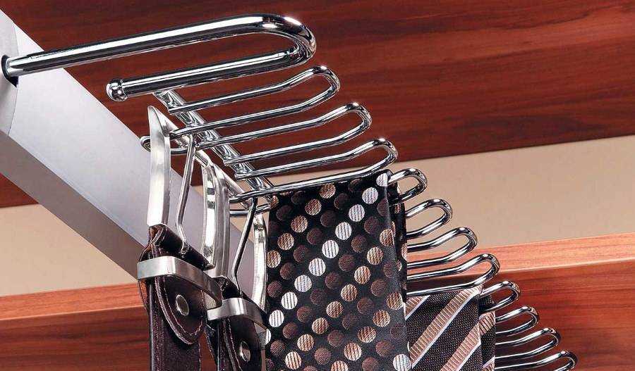 - Например, для размещения ремней можно встроить выдвижную вешалку, предназначенную именно для этого предмета гардероба.