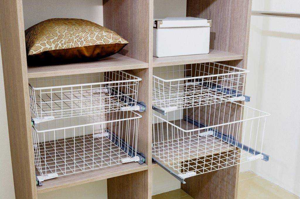 Для быстрого выбора предметов гардероба используют выдвижные сетчатые корзины из нескольких ярусов. Принцип их работы ровно такой же, как и у ящиков.