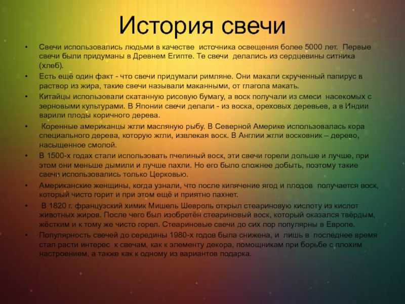 Слайд 4История свечиСвечи использовались людьми в качестве источника освещения более 5000 лет.
