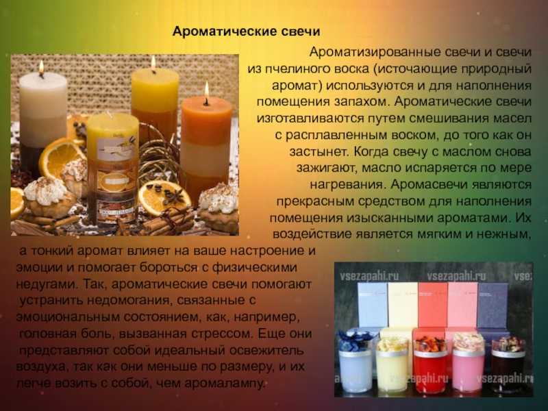 используются и для наполнения помещения запахом. Ароматические свечи изготавливаются путем смешивания масел с расплавленным воском, до того как он застынет. Когда свечу с маслом снова зажигают, масло испаряется по мере нагревания. Аромасвечи являются прекрасным средством для наполнения помещения изысканными ароматами. Их воздействие является мягким и нежным, а тонкий аромат влияет на ваше настроение и эмоции и помогает бороться с физическими недугами. Так, ароматические свечи помогают устранить недомогания, связанные с эмоциональным состоянием, как, например, головная боль, вызванная стрессом. Еще они представляют собой идеальный освежитель воздуха, так как они меньше по размеру, и их легче возить с собой, чем аромалампу.