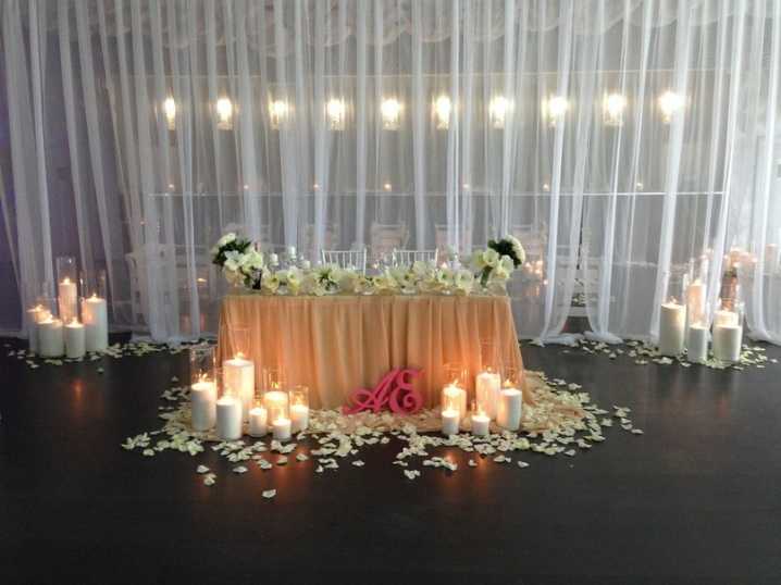 Для создания необычного стола для молодоженов можно расставить насыпные варианты в тандеме с лепестками роз и цветочными композициями.