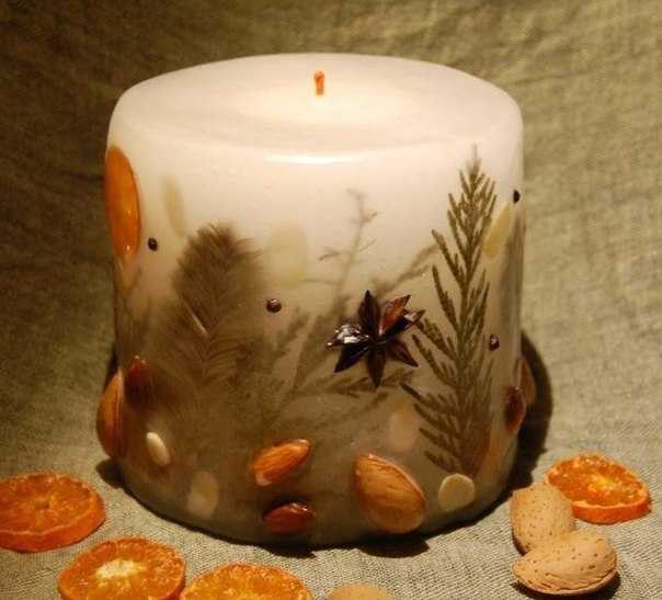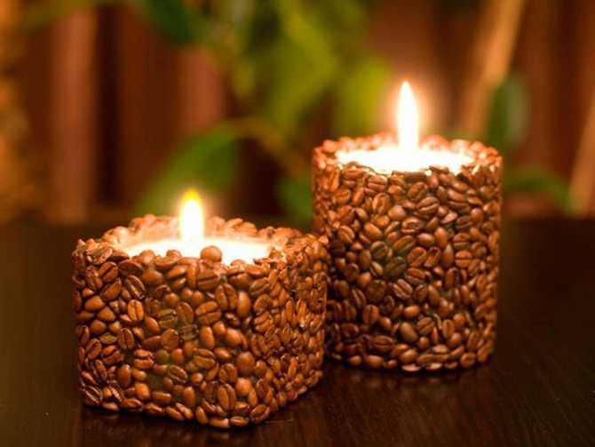 Еще одним вариантом изготовления может быть украшение готовой свечи кофейными зернами.