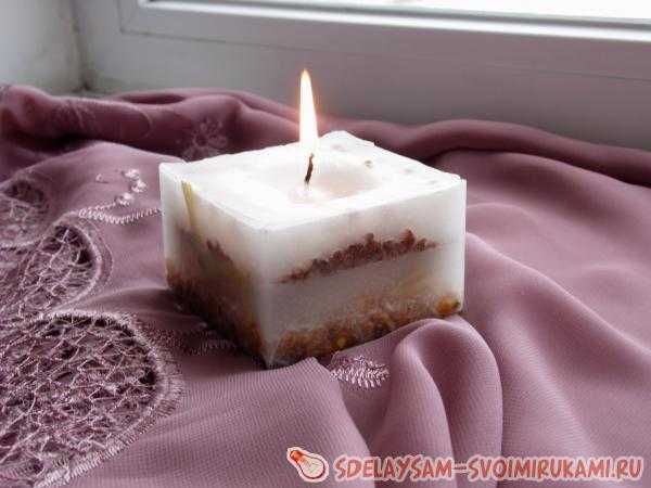 , будет достаточно темной благодаря включениям прополиса. Ее преимущество – довольно сильный натуральный медовый аромат и полезные вещества, выделяемые при горении. Обычно такие свечи делают вручную. Свечи, изготовленные на заводе, скорее всего, будут светлыми и практически лишенными запаха, поскольку на промышленных предприятиях воск предварительно очищают.