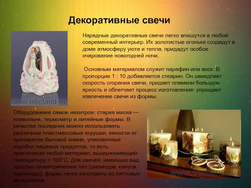 Слайд 18Декоративные свечиОборудование самое нехитрое: старая миска — плавильня, термометр и литейные