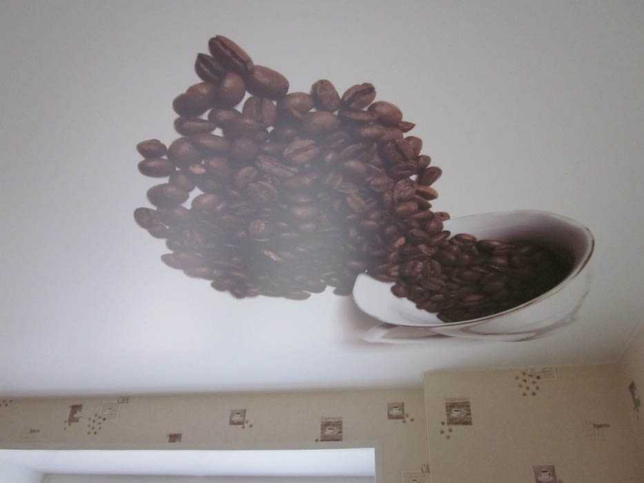 рисунок – точнее говоря, условное или абстрактное изображение, например, букет цветов, чашка кофе, затейливая красочная виньетка. Такой декор удобен тем, что позволяет зонировать комнату, так как собственно изображение занимает не весь потолок, а лишь какую-то его часть